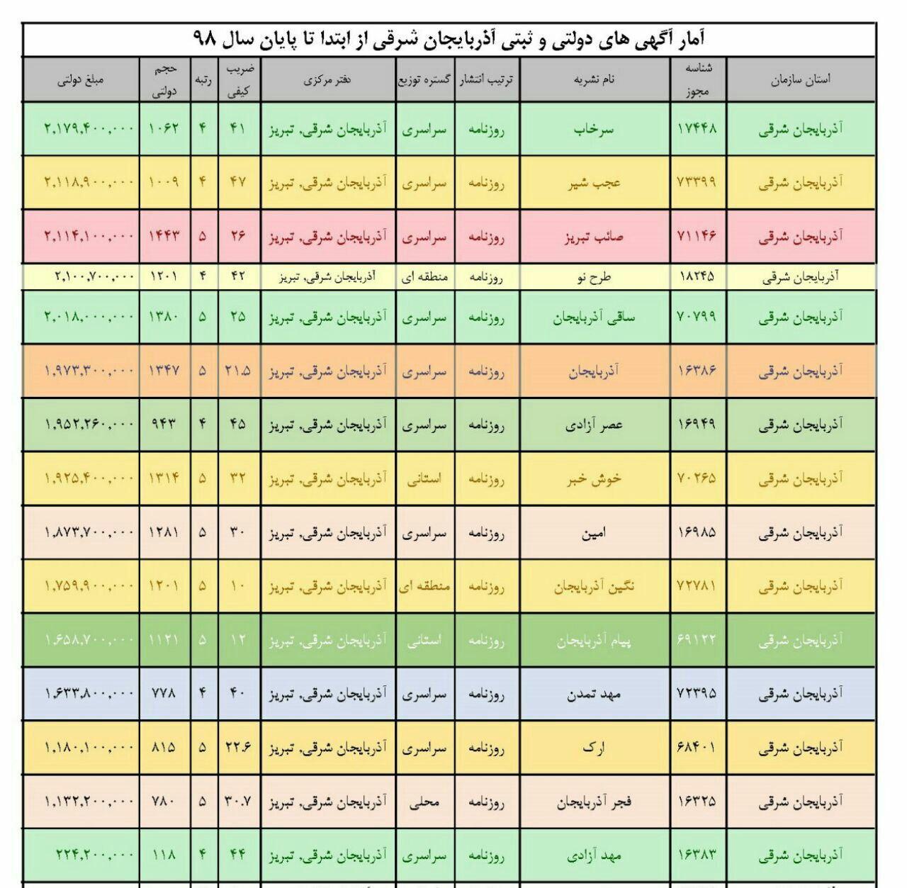 کدام روزنامه های آذربایجان شرقی بیشترین آگهی های دولتی را دریافت کرده اند؟