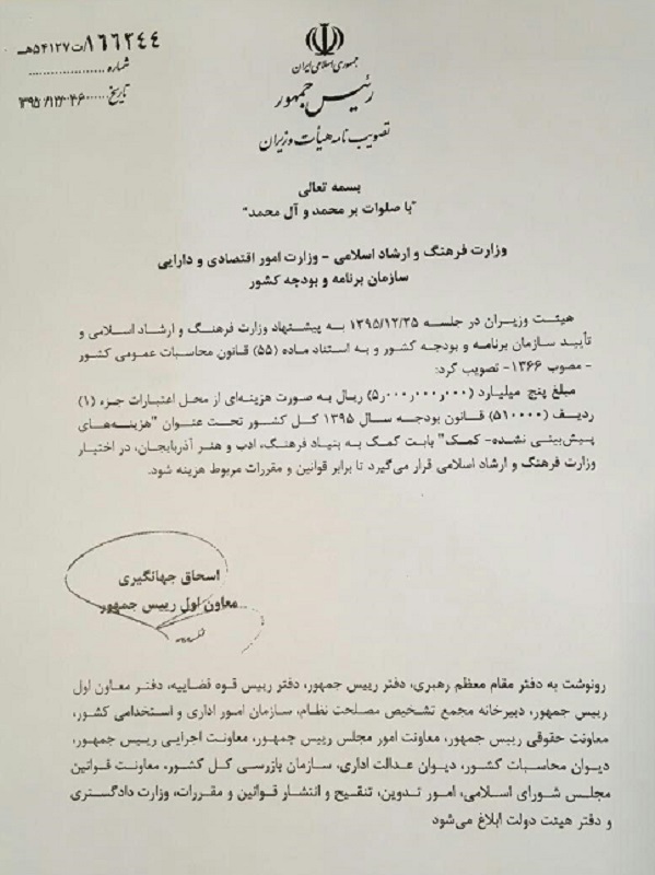صریر: به دستور جناب آقای روحانی رئیس جمهوری محترم در جلسه مورخه ۲۵ اسفند سال ۱۳۹۵ هیات وزیران مبلغ ۵ میلیارد ریال اعتبار برای بنیاد فرهنگ ، هنر و ادب آذربایجان اختصاص یافت.