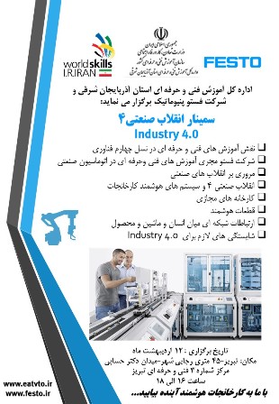 صریر: اداره کل آموزش فنی و حرفه ای استان آذربایجان شرقی و شرکت فستو پنیوماتیک سمینار انقلاب صنعتی ۴ را در مرکز آموزش فنی و حرفه ای شماره سه تبریز برگزار می کند .